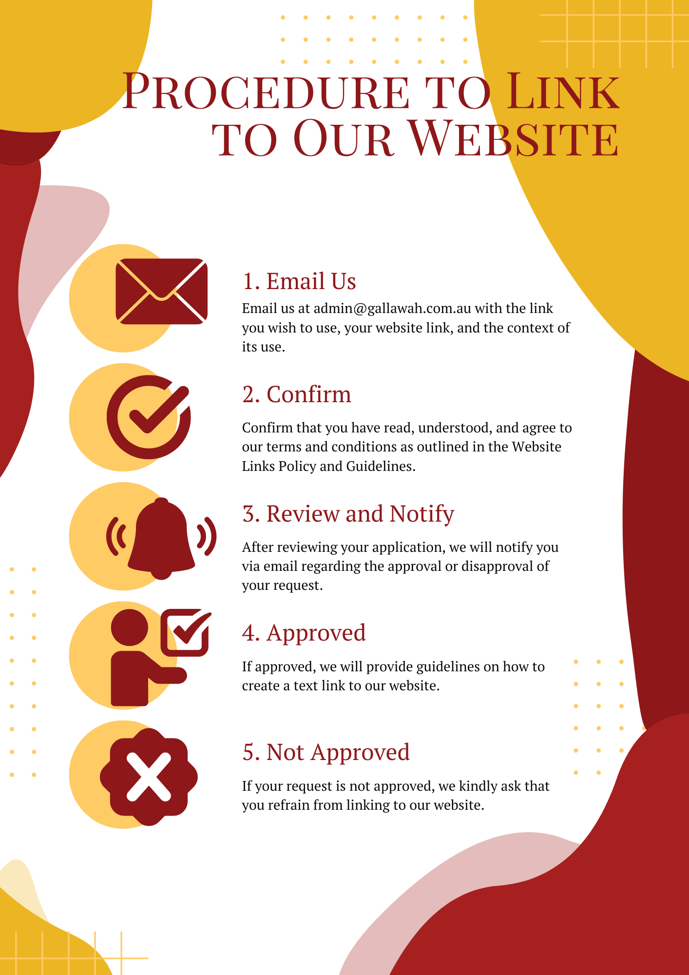 Gallawah reserves the right to refuse any link submitted for placement on our website. We will only link to external websites that align with our guidelines.